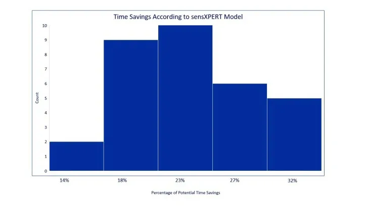 Alles in allem führte die Zusammenarbeit zwischen sensXPERT und NETZSCH Pumpen & Systeme zu mehreren erfolgreichen Ergebnissen. Das folgende Histogramm veranschaulicht das potenzielle Zeitersparnispotenzial während der Vulkanisation. Das Histogramm zeigt, wie die Integration von sensXPERT im Durchschnitt ein Einsparpotenzial von 23 % der Vulkanisationszeit bietet, wobei die minimalen und maximalen potenziellen Einsparungen bei extremen Zyklen bei 14 % bzw. 32 % liegen.