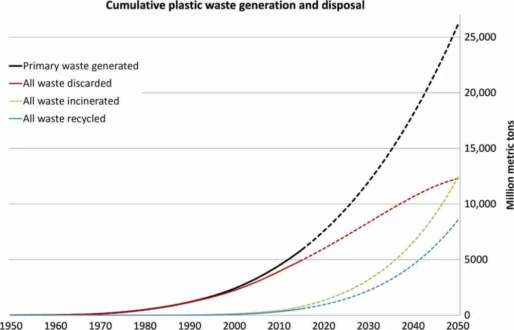 Cumulative plastic waste generation and disposal (in million metric tons). Sourcwe: Science.org